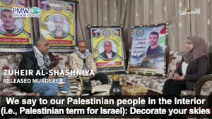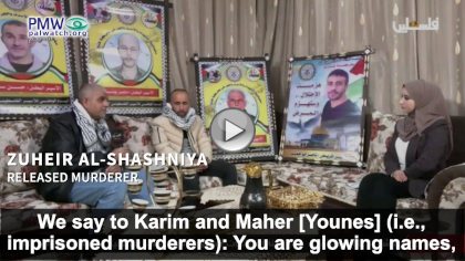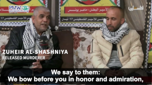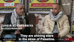 Released murderer Zuheir Al-Shashniya: “We say to Karim and Maher [Younes] (i.e., imprisoned murderers): You are glowing names, shining names in the skies of Palestine. We say to our Palestinian people in the Interior (i.e., Palestinian term for Israel): Decorate your skies and decorate your land for Karim’s reception. Every day that passes is a victory for us for the reception of these two mighty heroes, who taught us the organizational method of operation… They are shining stars in the skies of Palestine. We say to them: We bow before you in honor and admiration, you are greater than everything in Palestine. You are all of Palestine.”