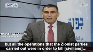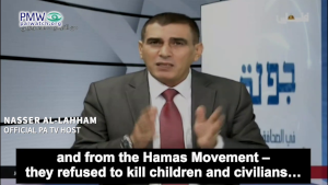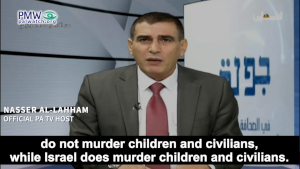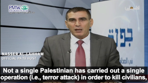 Palestinian Media Watch exposed one such “big lie” told by Nasser Al-Lahham, a regular host on official PA TV, who whitewashed all Palestinian terrorists, claiming they have “refused to kill children and civilians.” Ignoring the entire history of Palestinian terror, in which thousands of Israeli civilians have been targeted and murdered, Al-Lahham even went so far as to say that Israelis seek to kill Palestinian civilians and children.