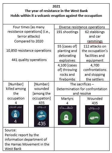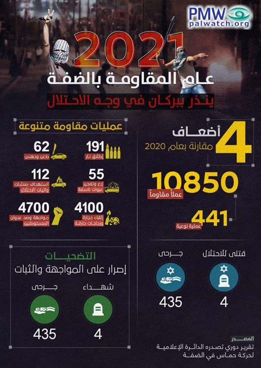 According to the flier, in 2021 Hamas terrorists carried out “four times” the number of terror attacks carried out by its terrorists in 2020. Of the 10,850 “resistance operations” - the Palestinian euphemism for acts of terror - 441 were “quality operations” apparently including “191 shootings”, “62 stabbings and car rammings” and “55 [incidents of] planting and detonating explosives.” The flier also noted that Hamas terrorists participated in “4,100 [cases of] throwing rocks and firebombs” and “4,700 confrontations and stopping the settlers”:
