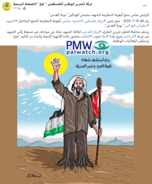 The image shows Suleiman Al-Hathalin, an Arab protester who died while participating in a violent riot, with his legs depicted as tree trunks rooted in the ground, a Palestinian flag flying from his staff, and wings on his back.