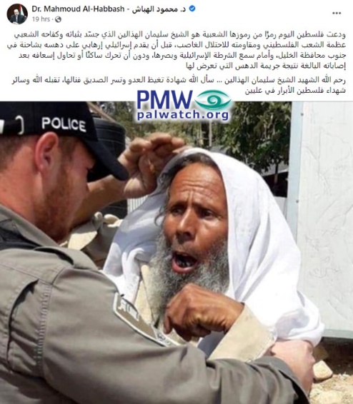 Posted text: “Today [Jan. 18, 2022] Palestine bids farewell to one of its popular symbols, Sheikh Suleiman Al-Hathalin (i.e., Arab protester killed while participating in a violent riot), who with his firmness and popular struggle embodied the Palestinian people’s greatness and its resistance to the thieving occupation, but a terrorist Israeli ran him over with his truck in the southern Hebron district (sic., refers to driver of tow truck in service of police who was wounded by rocks in the riot and tried to flee, hitting Al-Hathalin who was blocking his vehicle). This was before the eyes and ears of the Israeli police, who did not raise a finger or attempt to provide him with aid after he was severely wounded as a result of the car-ramming crime (police were unable to provide aid because they were under attack by rock-throwing Arab rioters -Ed.).