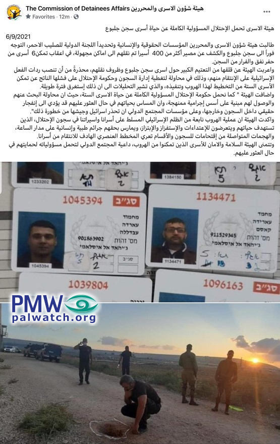 The commission emphasized that the escape stems from the Israeli tyranny that is being directed against our male and female prisoners in the occupation prisons, whose lives are a target for attack and who are being subjected to attacks, provocations, and robbery. Medical and humanitarian crimes are also being committed against them around the clock (sic., see note below regarding PA libel on medical abuse of Palestinian prisoners)…