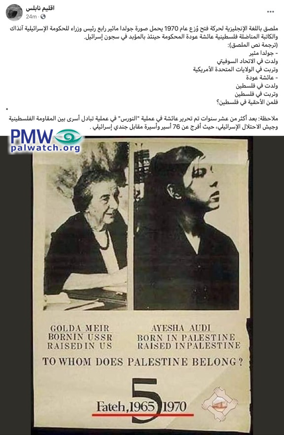 Posted text: “A Fatah Movement poster in English that was distributed in 1970, which bears a picture of then fourth Prime Minister of the Israeli Government Golda Meir and of Palestinian female writer and fighter Aisha Odeh (i.e., terrorist, murdered 2 people), who was sentenced to life in Israel’s prisons at the time.