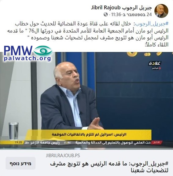 The video shows an interview of Fatah Central Committee Secretary Jibril Rajoub on Fatah-run Awdah TV.