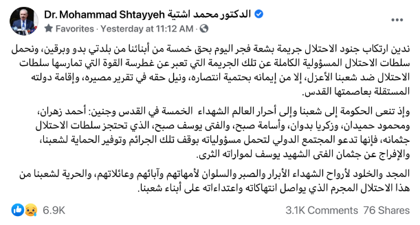 Text posted on the Facebook page of PA Prime Minister Muhammad Shtayyeh