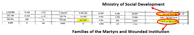 While the PA budget performance reports show only the combined expenditure of the “Ministry of Social Affairs” more in-depth PA financial reports clearly show that the PA payments to the wounded terrorists and the families of the dead terrorists are included in the expenditure for “Social Affairs.”