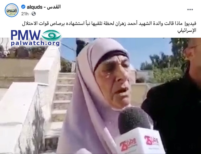 Posted text: “Video | What the mother of Martyr Ahmed Zahran (i.e., Hamas terrorist) said after receiving news of his death as a Martyr by the bullets of the Israeli occupation forces (refers to one of 5 Hamas and Islamic Jihad terrorists who were killed in an Israeli operation to thwart an imminent attack -Ed.)”