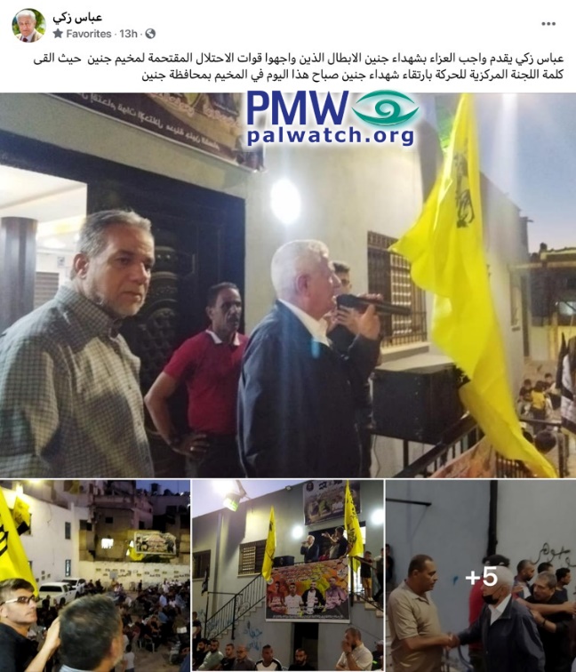 Posted text: “[Fatah Central Committee member] Abbas Zaki arrives for a condolence visit for the heroic Martyrs of Jenin who confronted the occupation forces who invaded the Jenin refugee camp (refers to terrorists who were killed after shooting at Israeli security forces conducting arrests -Ed.). [Zaki] gave a speech for the [Fatah] Movement Central Committee after the death of the Martyrs of Jenin this morning [Aug. 16, 2021] in the refugee camp in the Jenin district.”