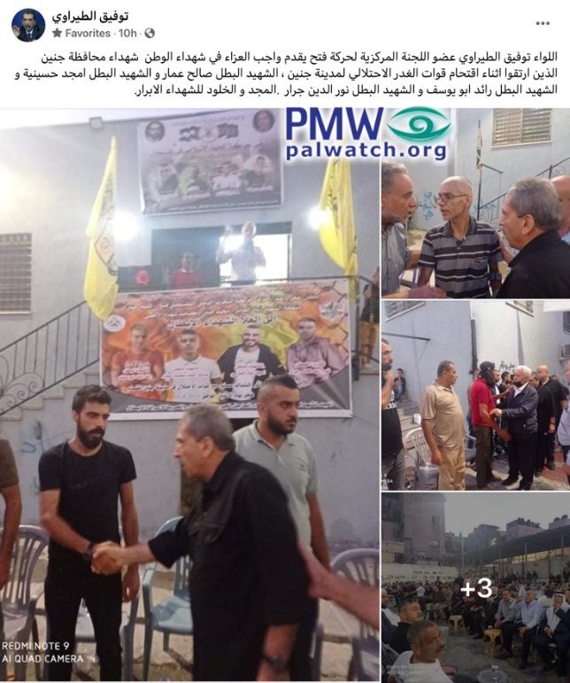 Posted text: “Fatah Movement Central Committee member Maj. Gen. Tawfiq Tirawi arrives for a condolence visit for the Martyrs of the homeland, the Martyrs of the Jenin district, who died during the treacherous occupation forces’ invasion of Jenin (refers to terrorists who were killed after shooting at Israeli security forces conducting arrests on Aug. 16, 2021 -Ed.). Heroic Martyr Saleh Ammar, heroic Martyr Amjad Husseiniya, heroic Martyr Raed Abu Yusuf, and heroic Martyr Nour Al-Din Jarrar. Glory and eternity to the pure-hearted Martyrs.”