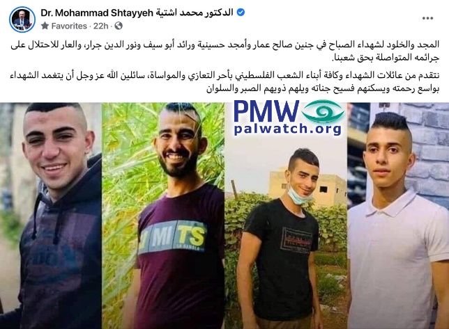 Posted text: “Glory and eternity to the Martyrs this morning [Aug. 16, 2021] in Jenin – Saleh Ammar, Amjad Husseiniya, Raed Abu Yusuf, and Nour Al-Din Jarrar (refers to terrorists who were killed after shooting at Israeli security forces conducting arrests -Ed.); and shame on the occupation for its ongoing crimes against our people.