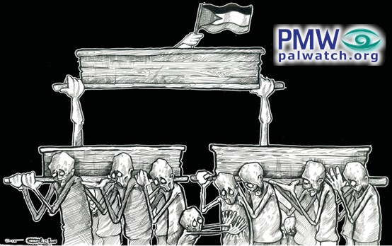 The cartoon shows people carrying two wooden coffins from which hands are extending and carrying a third wooden coffin, from which a hand is extending and waving a Palestinian flag. A child is pushing one of the pallbearers to stop the procession, in an apparent protest against their deaths.
