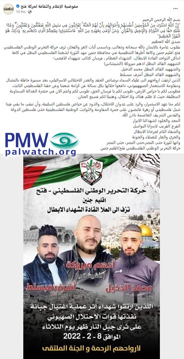 With hearts full of faith in Almighty Allah, and with great honor and pride, the Fatah Movement’s Jenin branch and all its organizational frameworks in the Jenin district… accompany [to their wedding] (i.e., Martyr's funeral is considered wedding to the 72 Virgins in Paradise in Islam) the heroic commanders, the lauded Martyrs, the knights of the Al-Aqsa Martyrs’ Brigades (i.e., Fatah’s military wing):