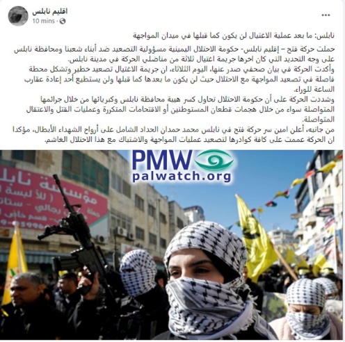 Posted text: “The Fatah Movement’s Nablus branch held the right-wing occupation government responsible for the escalation against our people and against the Nablus district specifically, with its latest incident being the crime of assassinating three Fatah fighters in Nablus (refers to assassination of Fatah terrorists planning an imminent shooting attack; see note below -Ed.).