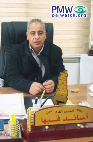 The article includes a picture of Head of the Tubas Education Directorate (i.e., branch of the PA Ministry of Education) Saed Qabha sitting at his desk. On his desk is a decoration in the shape of the PA map of “Palestine” that presents all of Israel together with the PA areas as “Palestine,” with a Palestinian flag on it.