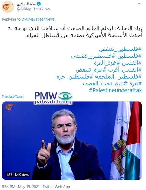 Islamic Jihad Secretary-General Ziyad Al-Nakhaleh: “Let the world, which is silent, know that our weapons – through which we are dealing with the most modern products of the American military industry – are water pipes that the resistance engineers have turned into the rockets that you see. Here the occupation state, with all its capabilities, is unable to deal with Gaza and its modest capabilities (refers to Israeli defensive operation in response to Hamas rocket barrages; see note below -Ed.).”