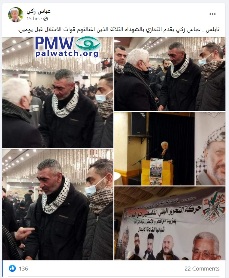 Posted text: “Nablus – [Fatah Central Committee member] Abbas Zaki consoles the families of the three Martyrs who were murdered by the occupation forces two days ago [Feb. 8, 2022] (refers to Fatah terrorists who were planning an imminent shooting attack; see note below -Ed.).”