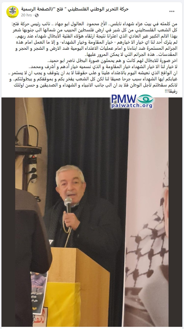 Posted text: “From the speech of Fatah Movement Deputy Chairman Mahmoud Al-Aloul ‘Abu Jihad’ at the house of consolation of the Nablus Martyrs (refers to three assassinated Fatah terrorists who were planning an imminent shooting attack; see note below -Ed.): ‘The entire Palestinian people from every inch of the beloved land of Palestine, from the north to the south, felt this great and unusual pain that struck us as a result of the ascent [to Heaven] of these heroic young people as Martyrs among their Lord. No one left us any option, other than their option, the option of resistance and the option of the Martyrs, [the option] to act against these ongoing crimes against our sons and to act against the daily attacks against the land, the trees, the stones, and the holy sites – these crimes that cannot be passed over in silence.