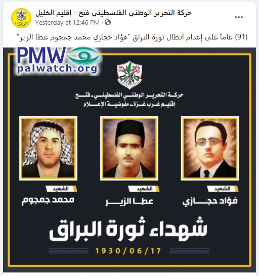 Posted text: “91 years since the execution of the heroes of the Al-Buraq Rebellion (i.e., 1929 Hebron Massacre and accompanying riots): Fuad Hijazi, Muhammad Jamjoum, and Ataa Al-Zir (i.e., murderers)”