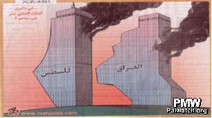 Iraq and the Palestinians are presented as the true Twin Tower victims.