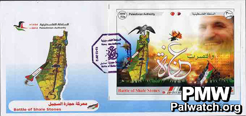 Palestinian Media Watch has previously documented stamps issued by Hamas in the name of the Palestinian Authority. For example the stamps below featuring rockets aimed at Israel from the Gaza Strip (2012) and a hand raising the Palestinian flag over all of Israel, implying political sovereignty over the entire area (2010):