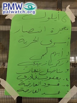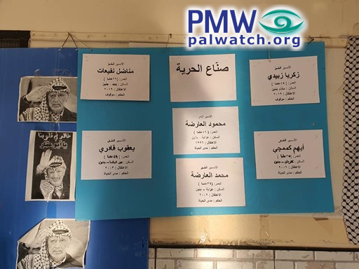 The image shows a poster on the left with images of former PLO and PA Chairman Yasser Arafat, and a poster in the center with text on it.