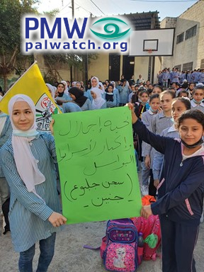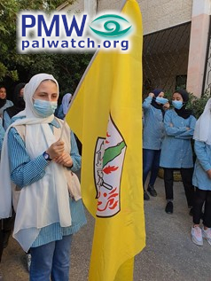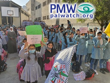The image shows children and adults holding Palestinian flags and a yellow Fatah flag; two of the students are wearing scarves that have “Palestine” written on them, and one of them is holding a sign.
