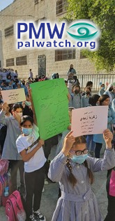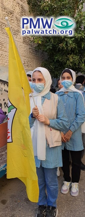The image shows children at morning roll call holding signs and flags bearing the Fatah logo that includes a grenade, crossed rifles, and the PA map of “Palestine” that presents all of Israel together with the PA areas as “Palestine.”