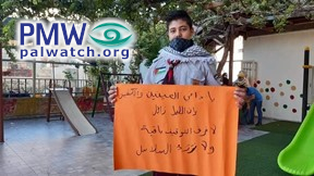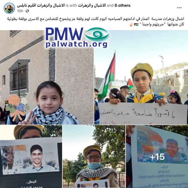 The images show children holding a poster with a picture of Fatah terrorist Zakariya Zubeidi, who was responsible for numerous attacks.