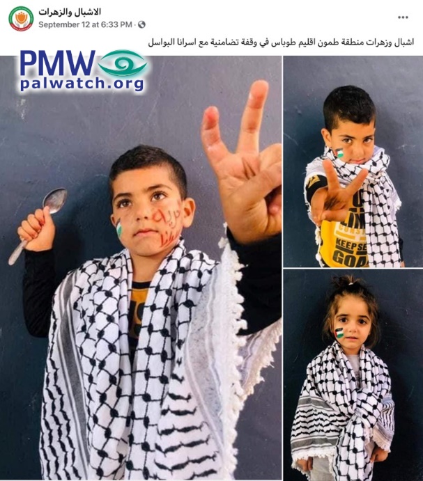 Posted text: “The Lion Cubs and Flowers [Institution] (i.e., the Fatah Youth Institution for Young Boys and Girls) – Tamoun sub-branch, Tubas branch, in a rally of solidarity with our heroic prisoners.”