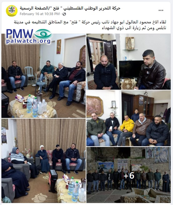Posted text: “A meeting of Fatah Movement Deputy Chairman Mahmoud Al-Aloul ‘Abu Jihad’ with the organizational branches in Nablus and afterwards a visit to the families of the Martyrs [Adham Mabrouka, Muhammad Al-Dakhil, and Ashraf Mubaslat] (i.e., terrorists who were killed when planning an imminent shooting attack)”