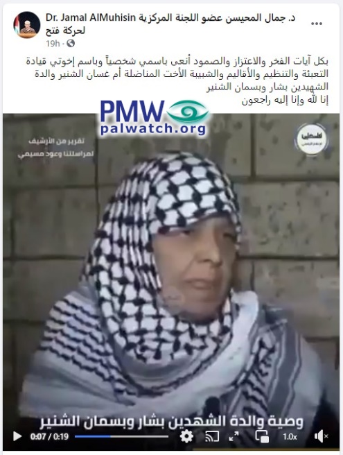Posted text: “With all the words of pride, appreciation, and resolve, on my own behalf and on behalf of my brothers in the [Fatah Commission of] Mobilization and Organization leadership, in the branches, and in the [Fatah] Shabiba [Youth Movement], I eulogize sister fighter Um Ghassan Shanir, the mother of Martyrs Bashar and Basman Shanir (i.e., both died while participating in violent armed confrontations with Israeli security forces)