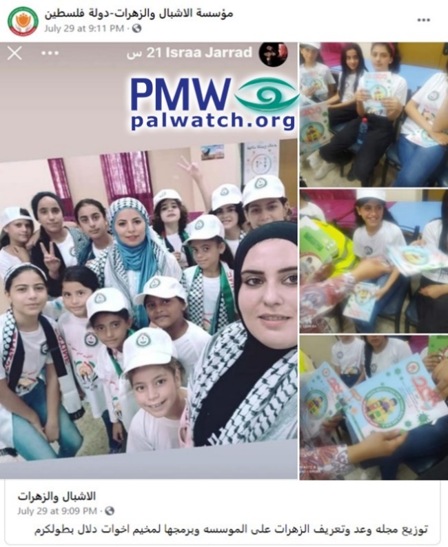 Posted text: "Distributing the Waed Magazine to girl [participants in] the 'Sisters of Dalal [Mughrabi]' summer camp (i.e., terrorist who led the murder of 37 people, 12 of them children) in Tulkarem and getting them familiar with the [Lion Cubs and Flowers] Institution and its programs.”