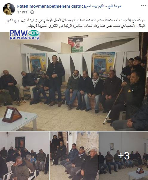In 2019, Fatah’s Bethlehem district dedicated a post on its Facebook page to a visit to the “family of heroic Martyr… out of loyalty to his pure blood”: