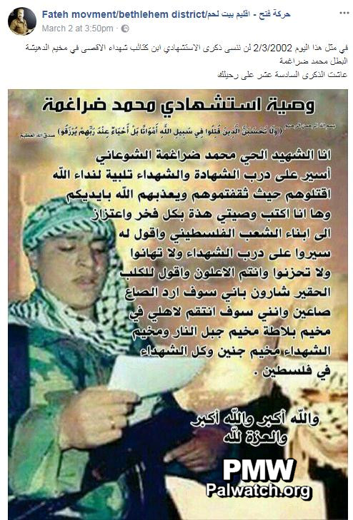 Posted text: “March 2, 2002 – we will not forget the anniversary of [the death of] the Martyrdom-seeker and member of the Al-Aqsa Martyrs’ Brigades (i.e., Fatah’s military wing) in the Deheisheh refugee camp, hero Muhammad Daraghmeh (i.e., suicide bomber, murdered 11)…”