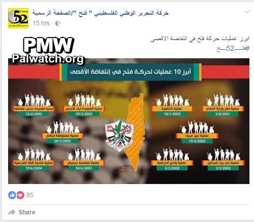 In 2016, the official Fatah Facebook page boasted "Fatah's most outstanding operations in the Al-Aqsa Intifada (the PA’s name for the Palestinian terror war launched in September 2000 and which raged on through 2005). Among the attacks Fatah boasted about, was the suicide bombing carried out by Al-Shou'ani: