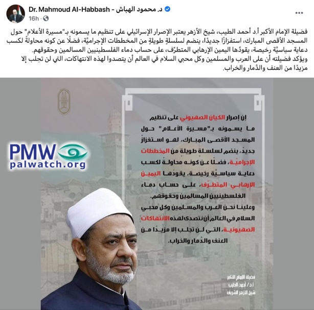 Posted text: “His Highness Grand Imam and Sheikh of Al-Azhar (i.e., a prominent Muslim academic institution in Cairo) Dr. Ahmed el-Tayeb views the Israeli insistence on organizing the so-called ‘flag march’ around the blessed Al-Aqsa Mosque (refers to rescheduled Israeli flag march that was cancelled on Jerusalem Day, May 10, 2021, due to Arab violence -Ed.) as a new provocation joining a long chain of criminal plans, in addition to it being an attempt to win cheap political propaganda that is being led by the extremist terrorist right-wing at the expense of the blood of the Palestinians and Muslims and their rights. His Honor said that the Arabs, Muslims, and all those who love peace in the world will stand against these attacks, which will only achieve violence, destruction, and ruin.”