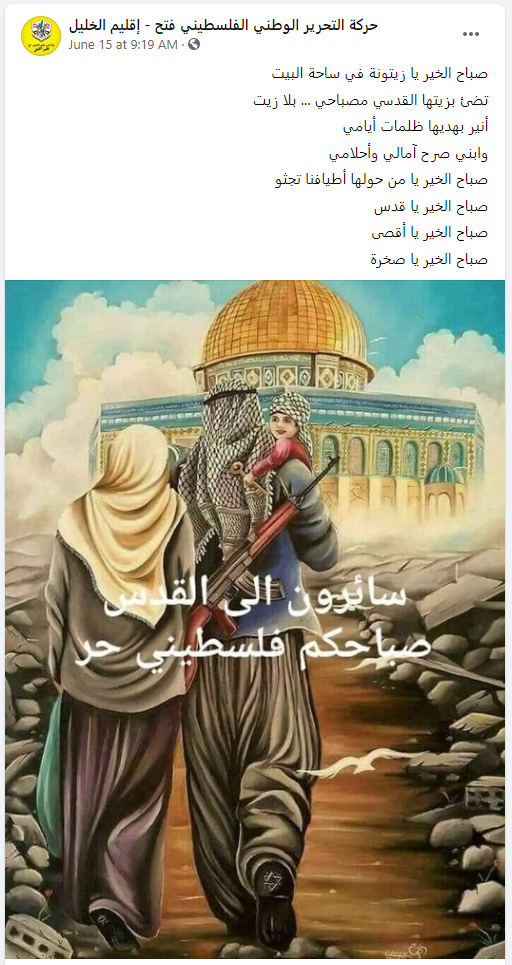 An image posted by Fatah on the Facebook page of Fatah in Hebron shows a man and a woman walking towards the Dome of the Rock. The man is carrying a small child in his arms and a rifle on his back. On the soles of their shoes is the Jewish Star of David.