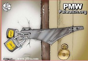 Lock in the shape of map claims all of IsraelAl-Hayat Al-Jadida, official PA daily |Sep 20, 2011Lock in the shape of map including PA areas as well as all of Israel. Text on top lock: "[the Arab] Weakness". Text on bottom lock: "Occupation" » View analysis citing this item