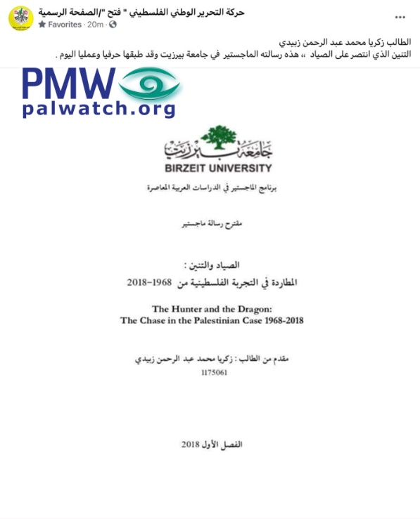 “The hunter and the dragon” – Fatah praises terrorist leader for "implementing" his thesis and escaping from Israeli prison