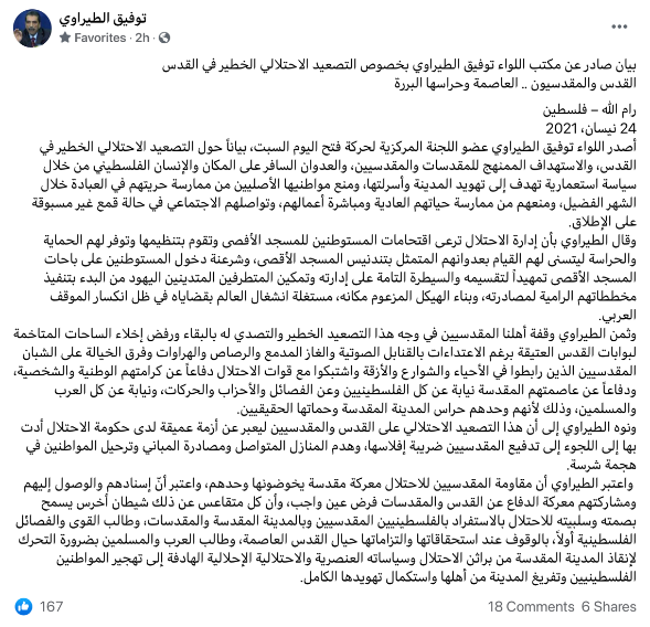 Posted text: “A statement from the office of [Fatah Central Committee member] Maj. Gen. Tawfiq Tirawi regarding the occupation’s severe escalation in Jerusalem