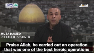 Released prisoner Musa Hamed: “I send greetings to all the prisoners, and especially to our brother Thaer Hammad. Today is the anniversary of the Wadi Al-Haramiya operation (i.e., Hammad’s terror attack), the operation whose voice echoed worldwide. The strength of this operation, which our brother Thaer carried out at a [young] age – the Israeli army and the occupation state were left confused about it for about three years. They didn’t know what happened. Praise Allah, he carried out an operation that was one of the best heroic operations that were carried out on the soil of the homeland.”