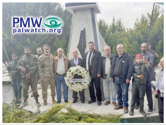 The article includes a picture from the monument in the Ain Al-Hilweh refugee camp in Lebanon, which features the PA map of “Palestine” that presents all of Israel together with the PA areas as “Palestine,” with “Palestine” written on it.