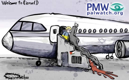 The cartoon shows a new immigrant fleeing Ukraine wearing a shirt in the colors of the Ukrainian flag and disembarking from an Israeli plane with a Star of David on it. The airplane stairs are made out of a demolished Palestinian house with a Palestinian flag painted on it, and a stream of blood is pouring down the stairs.