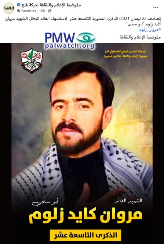 Posted text: “April 22, [2021,] is the 19th anniversary of the death as a Martyr of heroic commander Martyr Marwan Kayed Zalum ‘Abu Saja’ (i.e., terrorist, involved in murder of at least 9).