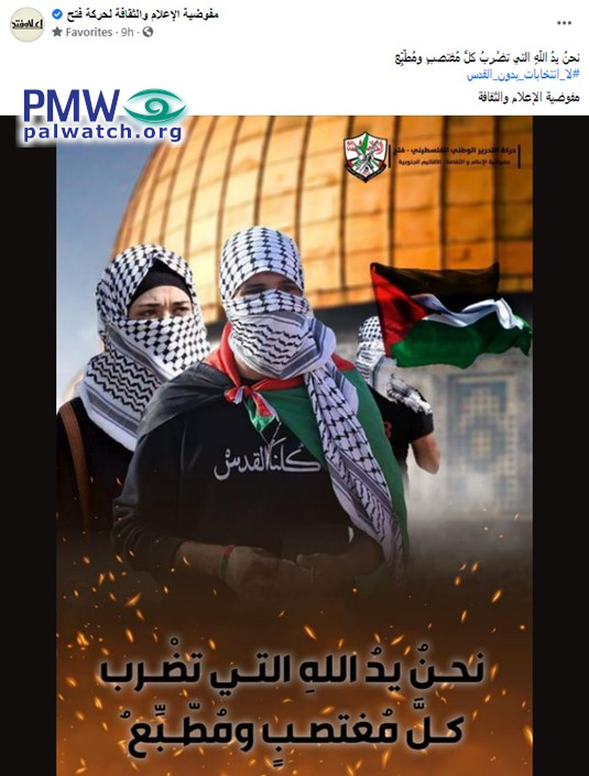 The image shows three masked people with keffiyehs (Arab headdress) and Palestinian flags, with the Dome of the Rock in the background. In the upper right corner is the Fatah logo that includes a grenade, crossed rifles, and the PA map of “Palestine” that presents all of Israel together with the PA areas as “Palestine.” At the bottom, sparks are rising upwards.