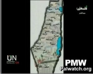 PA TV filler showing map of "Palestine" including PA areas as well as all of Israel. The following Israeli cities are presented as Palestinian: Acre, Haifa, Beit Shean, Be'er Sheva, Ramle, Safed, Tiberias, Nazareth, Jaffa and Lod.