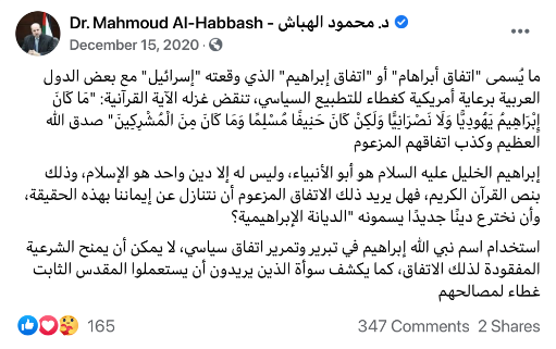 Using the name of Allah’s prophet Abraham to justify and pass a political agreement cannot give this agreement the legitimacy it is lacking. [The agreement] also exposes the shame of those who want to use the steadfast holy person as cover for their interests.”