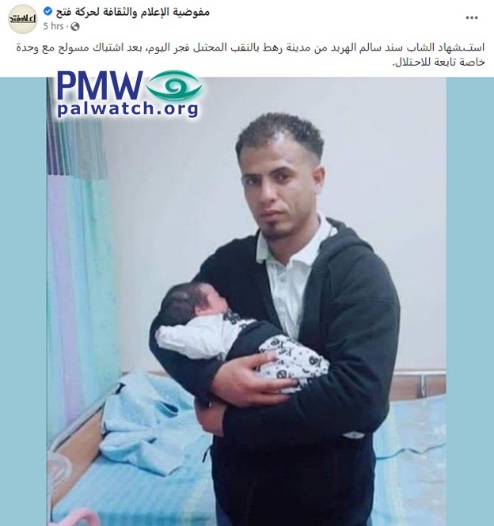 Posted text: “Sanad Salem Al-Harbad (i.e., terrorist, shot at Israeli security forces), a young person from Rahat in the occupied Negev (i.e., in southern Israel), died as a Martyr in the early morning hours today [March 15, 2022], after an armed confrontation with a special unit of the occupation.”