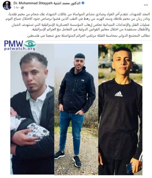 We express warm and sincere condolences to the families of the Martyrs who were shot by the occupation’s soldiers and died this morning [March 15, 2022]: Alaa Shaham (i.e., killed while participating in violent riots targeting Israeli security forces conducting arrests of two wanted terrorists) from the Qalandiya refugee camp, Nader Rayyan (i.e., terrorist, shot at Israeli security forces) from the Balata refugee camp, and Sanad Al-Harbad (i.e., terrorist, shot at Israeli security forces) from Rahat in the Negev (i.e., in southern Israel).
