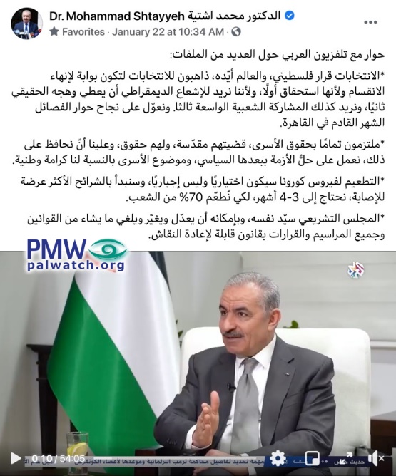 PA Prime Minister Muhammad Shtayyeh: “Our national project is connected to elections. The Palestinian people’s democratic life is connected [to elections]. Elections are not the only picture of democracy in any society, but they are among the most important reflections of democracy in any society… Elections are not foreign to the Palestinian people. We have held student elections, municipal elections, and chamber of commerce elections, and we have held national elections three times in the period of the PA – in 1996, 2005, and 2006. The most important thing for me is that 53% of the Palestinian people have not participated in any election process in the past – and it is important that people express their opinion at the ballot boxes and that there be true political participation.”